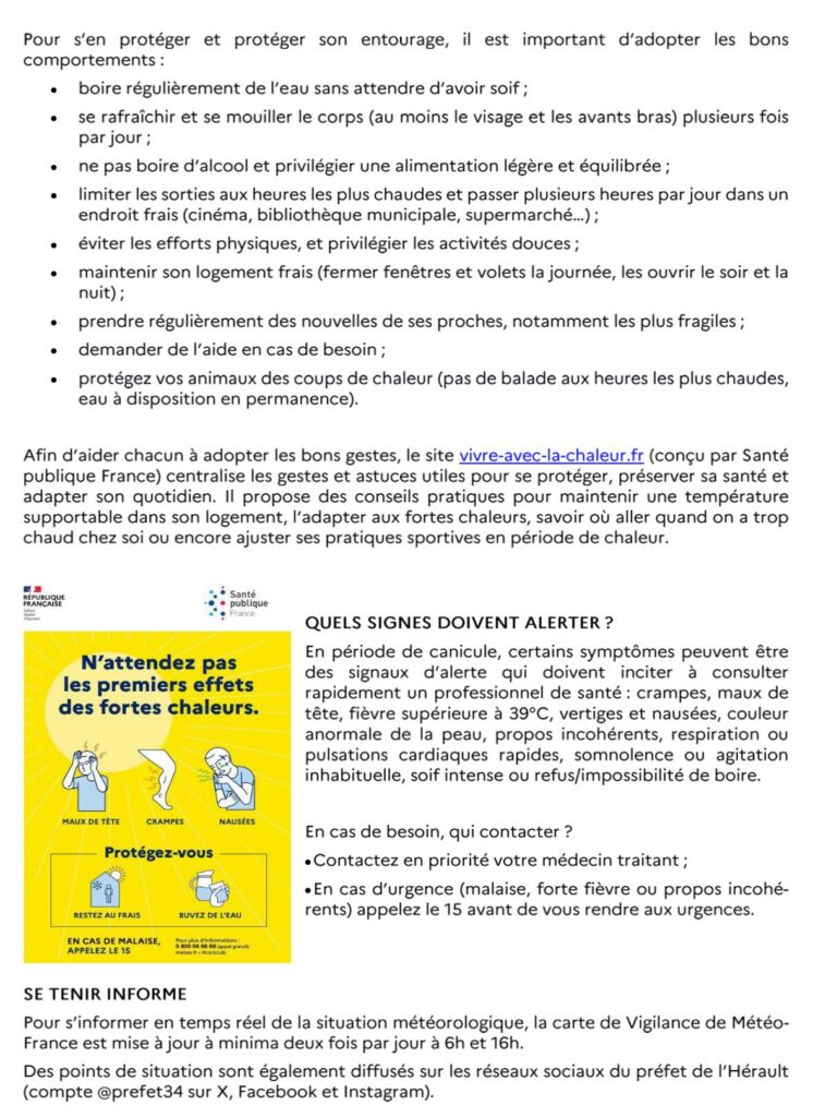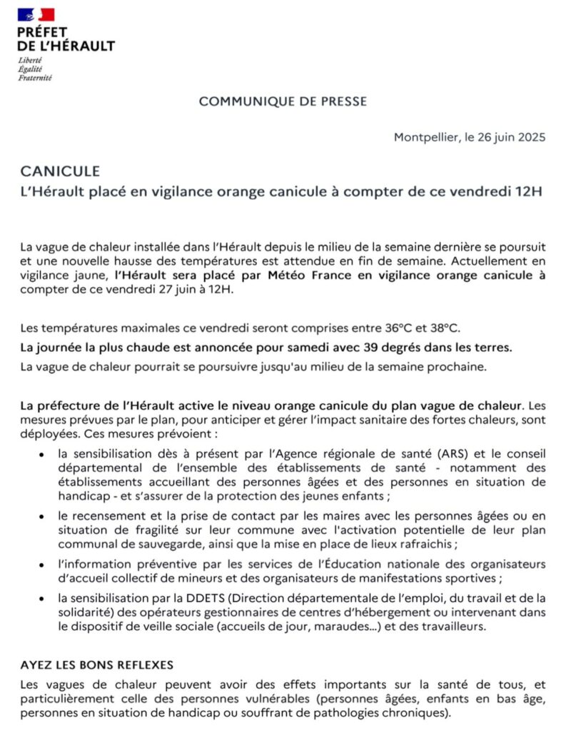 Actuellement en vigilance jaune, l’Hérault sera placé par Météo-France en vigilance orange canicule à compter de ce vendredi 27 juin à 12H.