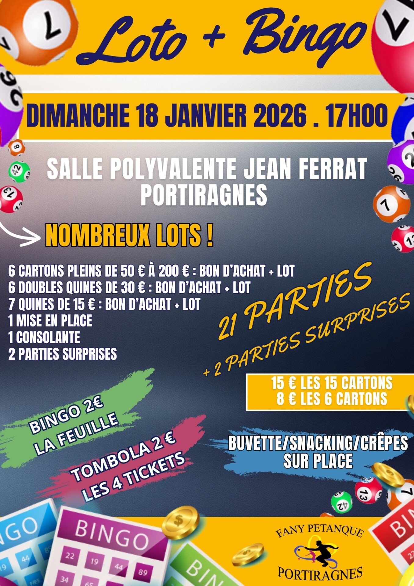 Date 18 Jan 2026 Expiré! Heure 17 h 00 min 𝗟𝗢𝗧𝗢 I Reprise des lotos ce dimanche ! I 𝗟𝗢𝗧𝗢 I Reprise des lotos ce dimanche ! L’association Fany Pétanque vous invite à son grand loto ! Dimanche 18 janvier 2026 À partir de 17h00 Salle Jean Ferrat – Portiragnes 21 parties + 2 parties surprises Bingo & Tombola Nombreux lots à gagner dont 6 cartons pleins d’une valeur de 50 € à 200 € en bons d’achat… Et bien d’autres lots à remporter ! Un moment convivial et plein de suspense vous attend. Venez tenter votre chance ! Partagez cet événement + Ajouter à mon Agenda Google + iCal / Outlook export