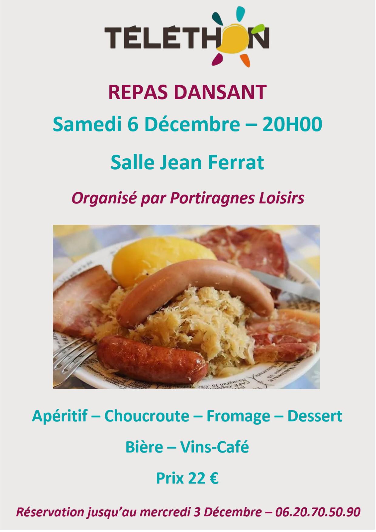 Dans le cadre du Tรฉlรฉthon 2025, lโassociation Portiragnes Loisirs vous invite ร un grand repas dansant !