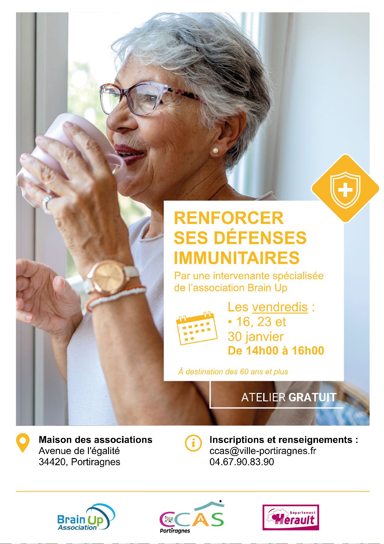 Le CCAS de Portiragnes, en partenariat avec l’association Brain Up, propose un programme gratuit intitulé « 𝑺𝒆 𝒔𝒐𝒊𝒈𝒏𝒆𝒓 𝒆𝒕 𝒓𝒆𝒏𝒇𝒐𝒓𝒄𝒆𝒓 𝒔𝒆𝒔 𝒅é𝒇𝒆𝒏𝒔𝒆𝒔 𝒊𝒎𝒎𝒖𝒏𝒊𝒕𝒂𝒊𝒓𝒆𝒔 ».